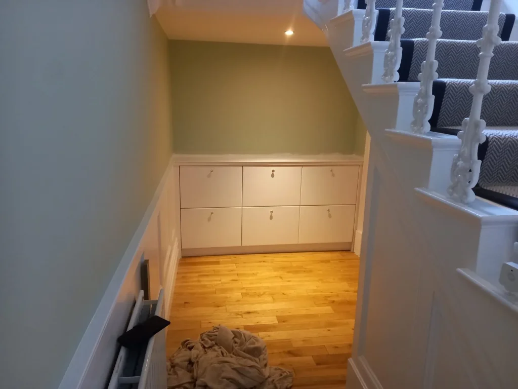 This is a job we did in Annagassan, Co. Louth. We used wells skirting board and architrave for this wall panelling. We painted it with Farrow & Ball Downpipe (eggshell). The doors on the under stair storage match the panelling and the carcass was made of Cambrian Oak.  Our clients were happy and left us this review: