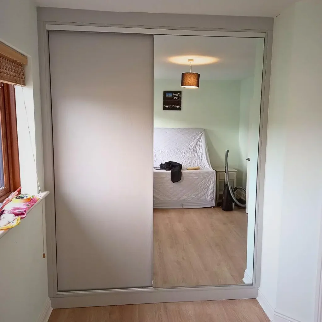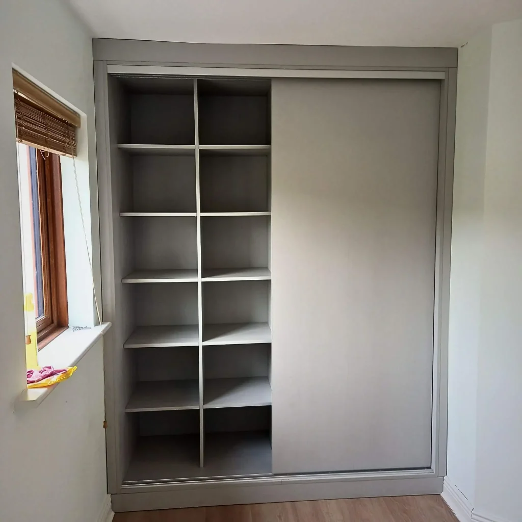 Sliding wardrobe made for a client in Ratoath, Co. Meath. The material used was Finsa Tango Natural Grey melamine board. Our client has left us this kind review: