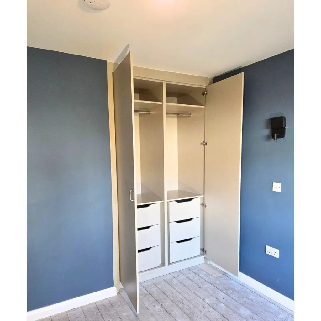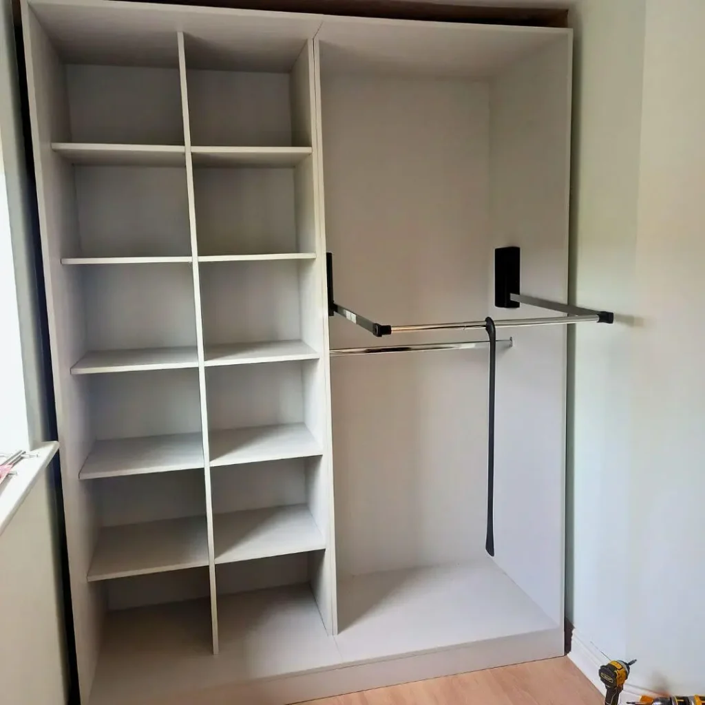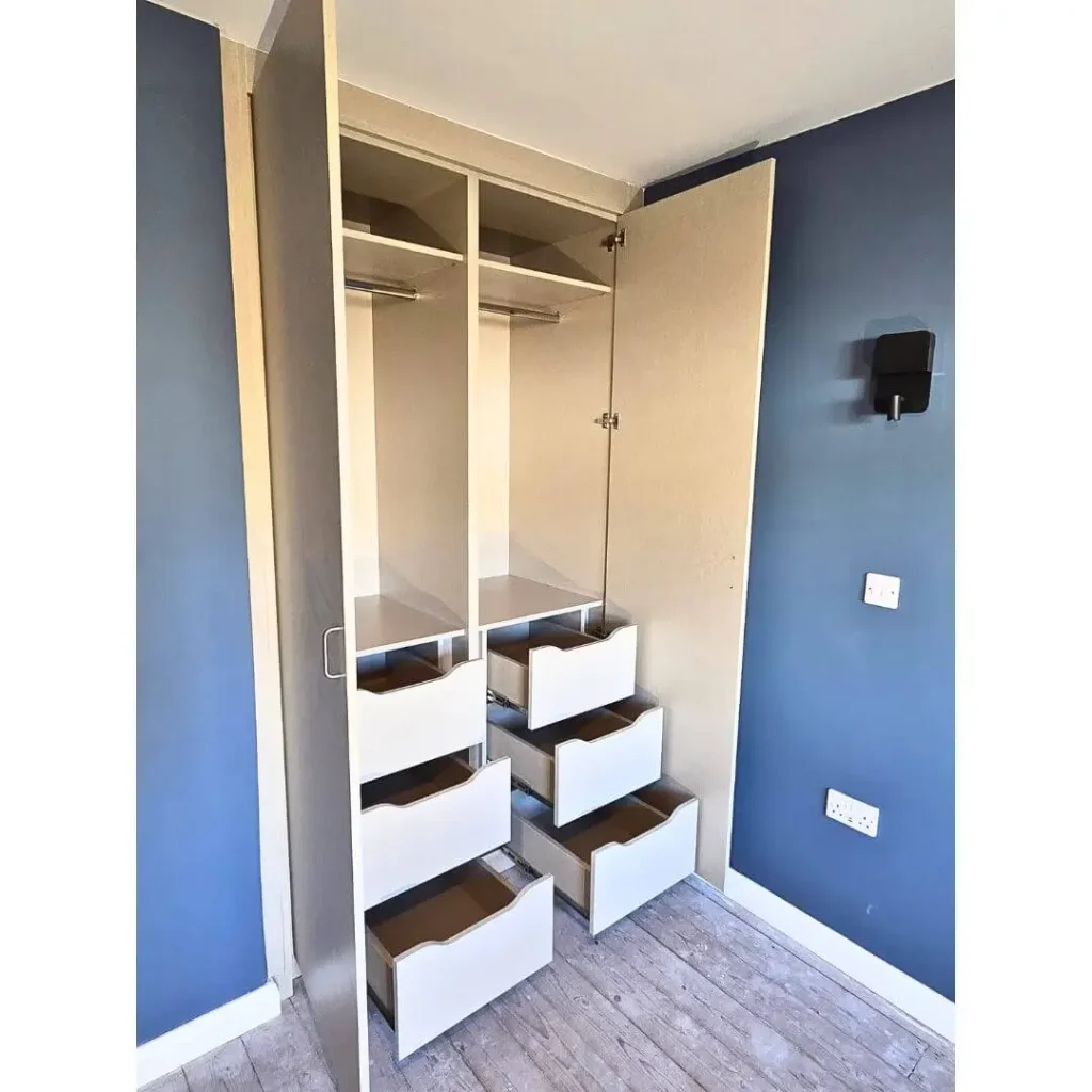 This is a small 2-door wardrobe done in Stameen, Drogheda. It has six internal scoop drawers, two hanging rails and 4 shelves. The wardrobe was made from Finsa Lino Cancun melamine board.