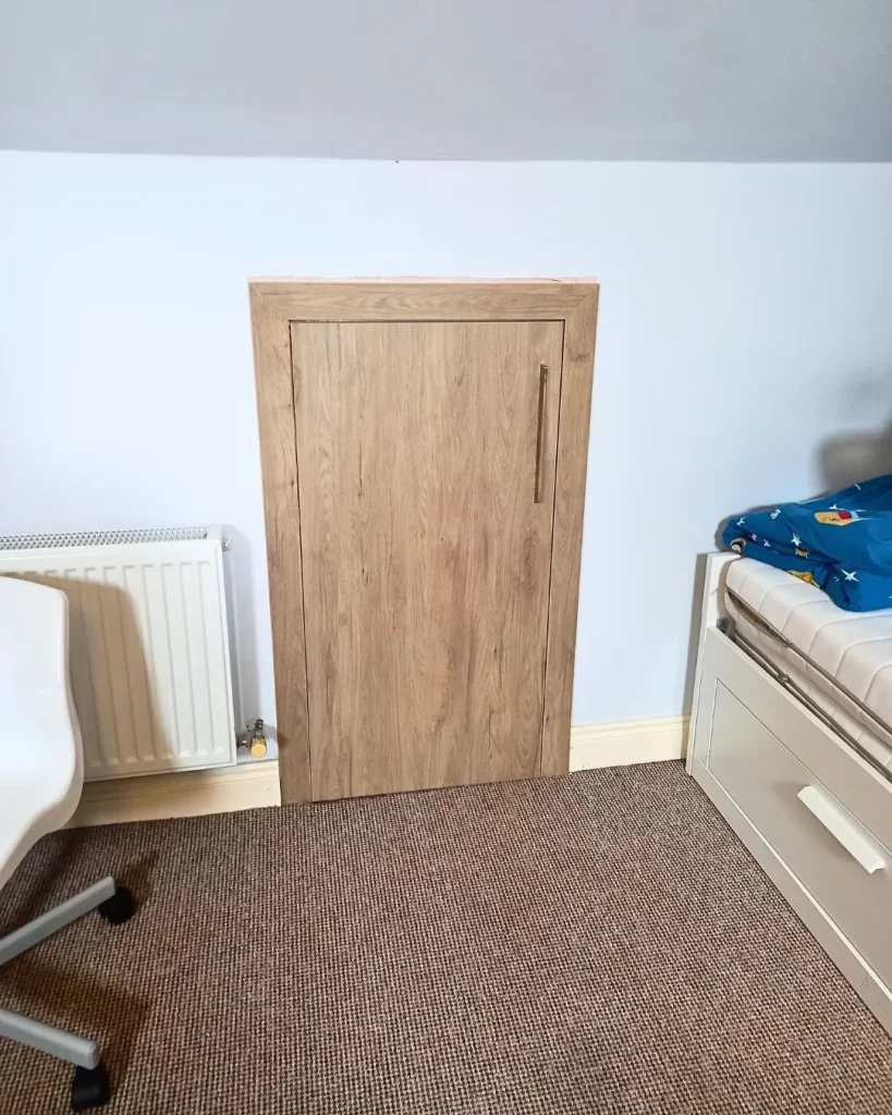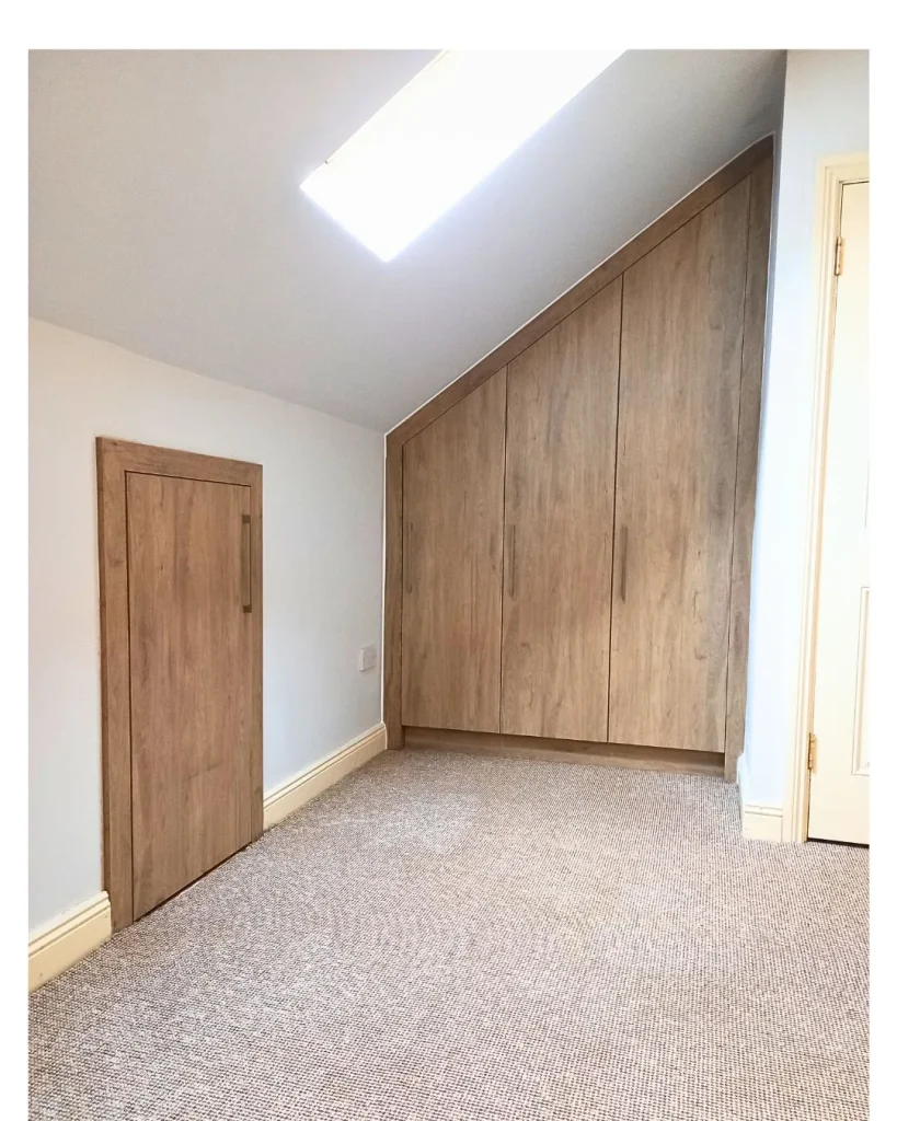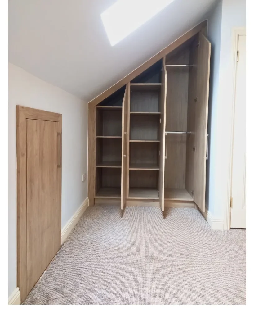 Wardrobe done in an attic room in Deepforde, Drogheda. We also made them two attic doors. Both doors and the wardrobe were made of Finsa Roble Denver melamine. This is the review our client left us: