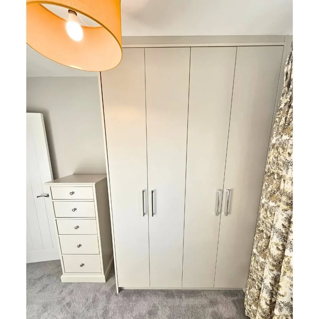This 4 door wardrobe was built for a client in Blackrock, Dundalk, Co. Louth. We used Finsa Gris Porrino melamine board, which was more or less an exact match to the existing chest of drawers. There are lots of hanging space inside with a few shelves. The handles used were the Kensington D Chrome.